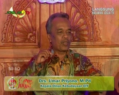Kepala Dinas Kebudayaan DIY, Drs. Umar Priyono, M.Pd saat menjadi narasumber Citra Jogja di Jogja TV, senin (12/10) mengatakan kehadiran mahasiswa dari berbagai etnis memberikan kontribusi terhadap dinamika budaya di Yogyakarta. Mereka diharapkan tidak hanya belajar akademik tetapi juga belajar budaya sesama anak bangsa. Untuk itu, Dinas Kebudayaan DIY menggelar kegiatan Semarak Legenda Suku Nusantara dengan tujuan supaya mahasiswa merasa betah tinggal di Yogyakarta dan bersatu menjadi satu ikatan keluarga. (Rumini)